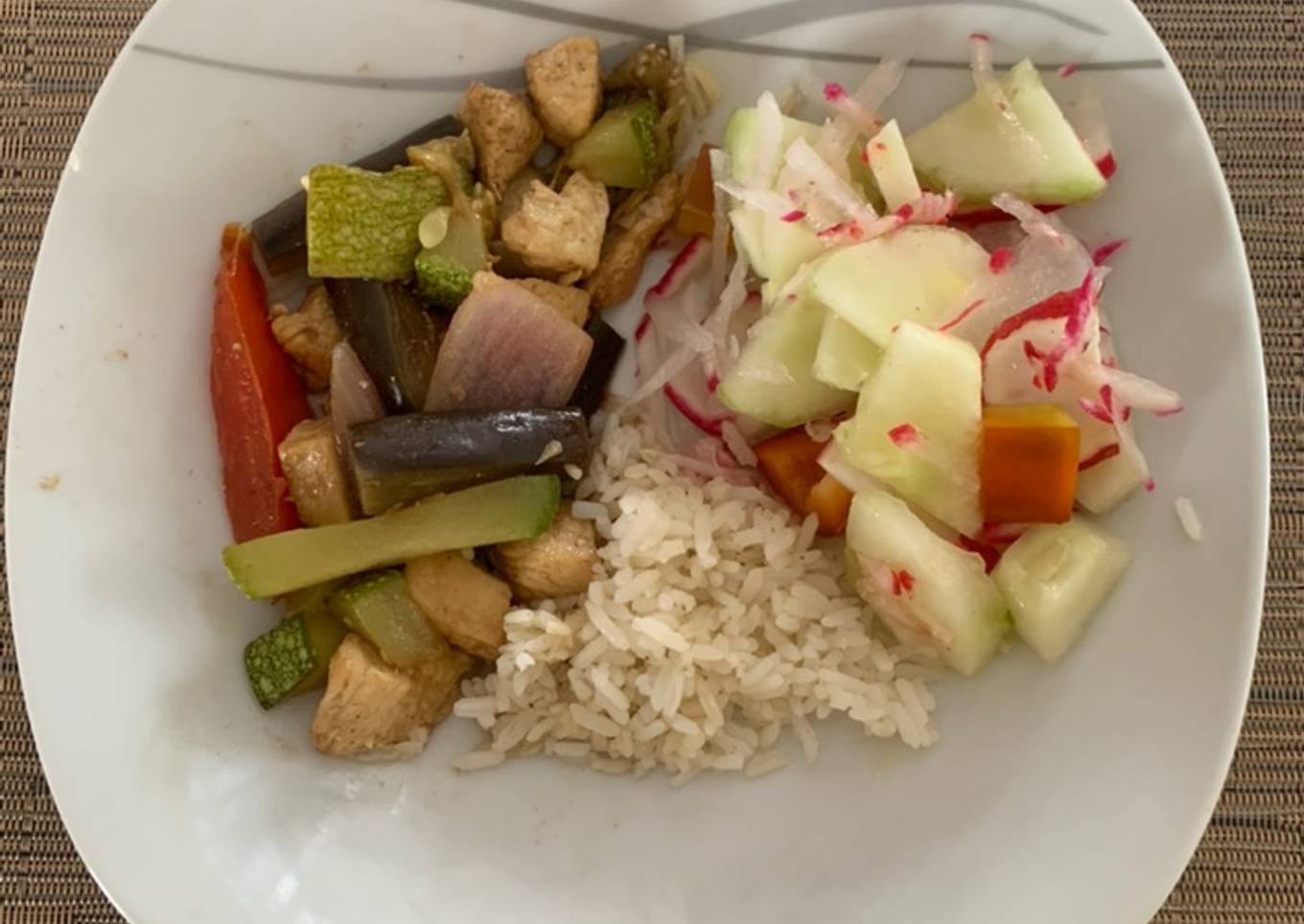 Saltado de pollo con berenjenas y zapallito italiano
