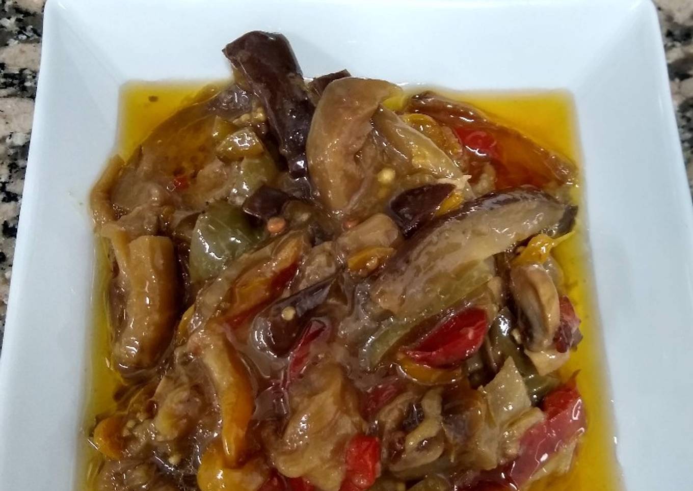 - Cortar todo en bastones o Juliana y saltear los morrones, luego la berenjena y por último los champiñones. Añadir los demás ingredientes y dejar reducir el vinagre por 40 minutos. Apagar, rectificar el sabor. Y listooooooo!