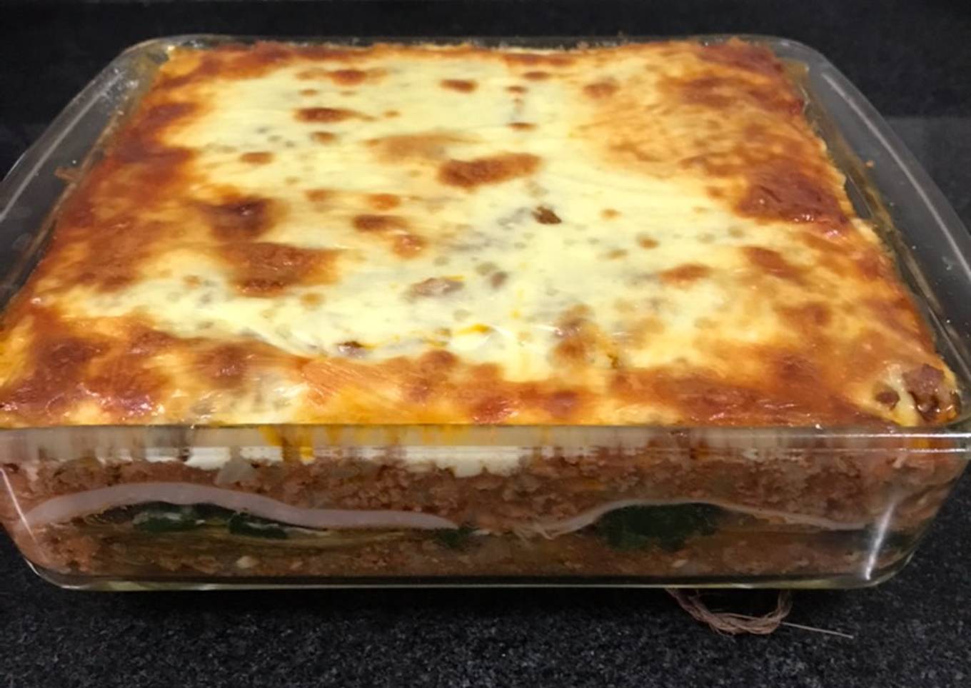- Ahora la espinaca, el queso parmesano ralladito, las rodajas de jamón, otra capa de berenjena y colocamos toda la carne con salsa y terminamos con el queso mozzarella por encima.