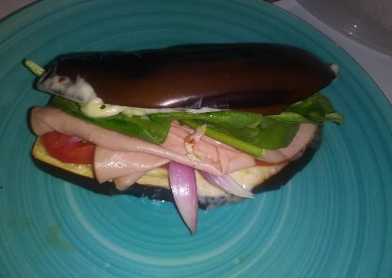 - Partir en lascas a lo largo la berenjena. Luego ponerla a la plancha para que se cocine. Una vez está lista agregas todos los ingredientes. El queso se va derretir pues la berenjena está caliente. Y listo! Buen provecho!!