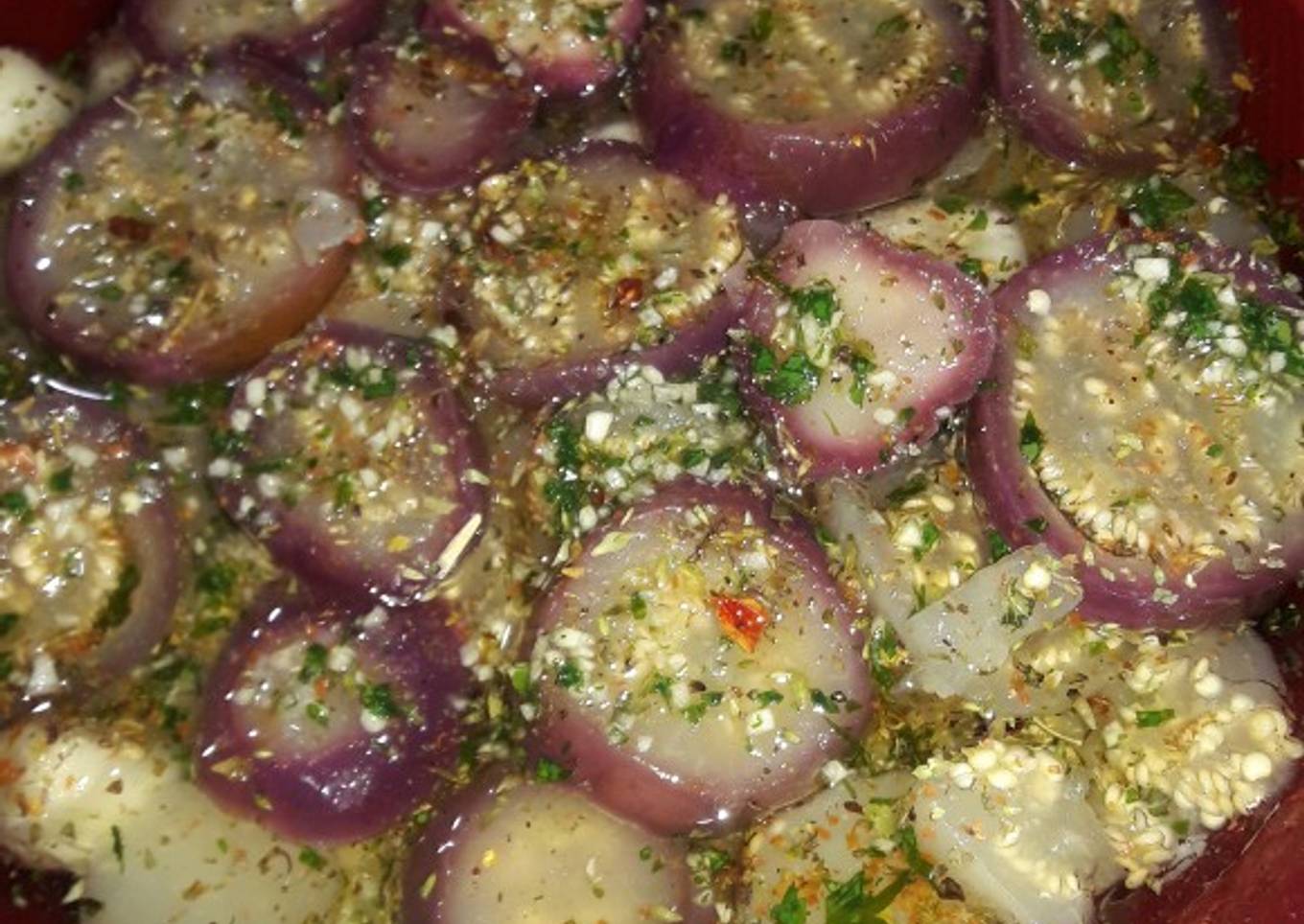 - Una vez frías, poner una capa de berenjena en una bandeja, preferentemente, de vidrio. Condimentar con todo lo que te guste!(ajo, perejil, condimentos) otra capa de berenjena, y condimentos, así sucesivamente. Una vez que terminas cubris con aceite en su totalidad. Si queres le agregas sal, pero no es necesario ya que las dejamos 30' en sal. Se guardan en la heladera.