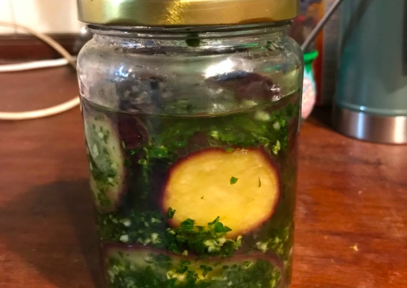 - Dejamos enfriar las berenjenas y luego en un frasco limpio y esterilizado, vamos metiendo las berenjenas (ya frΓas) acomodΓ‘ndolas bien, y vamos poniendo ente ellas un poco de provenzal.