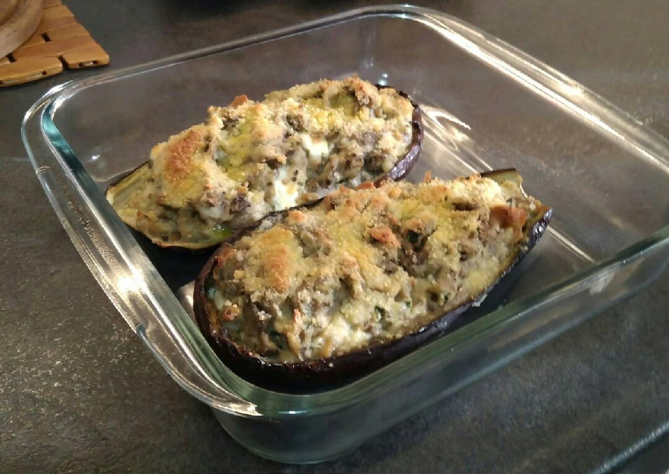 - Mezclar en un bowl la pulpa de las berenjenas, el pan, ajo, perejil, quesos, y huevos. Condimentar con sal y pimienta. Rellenar las berenjenas.