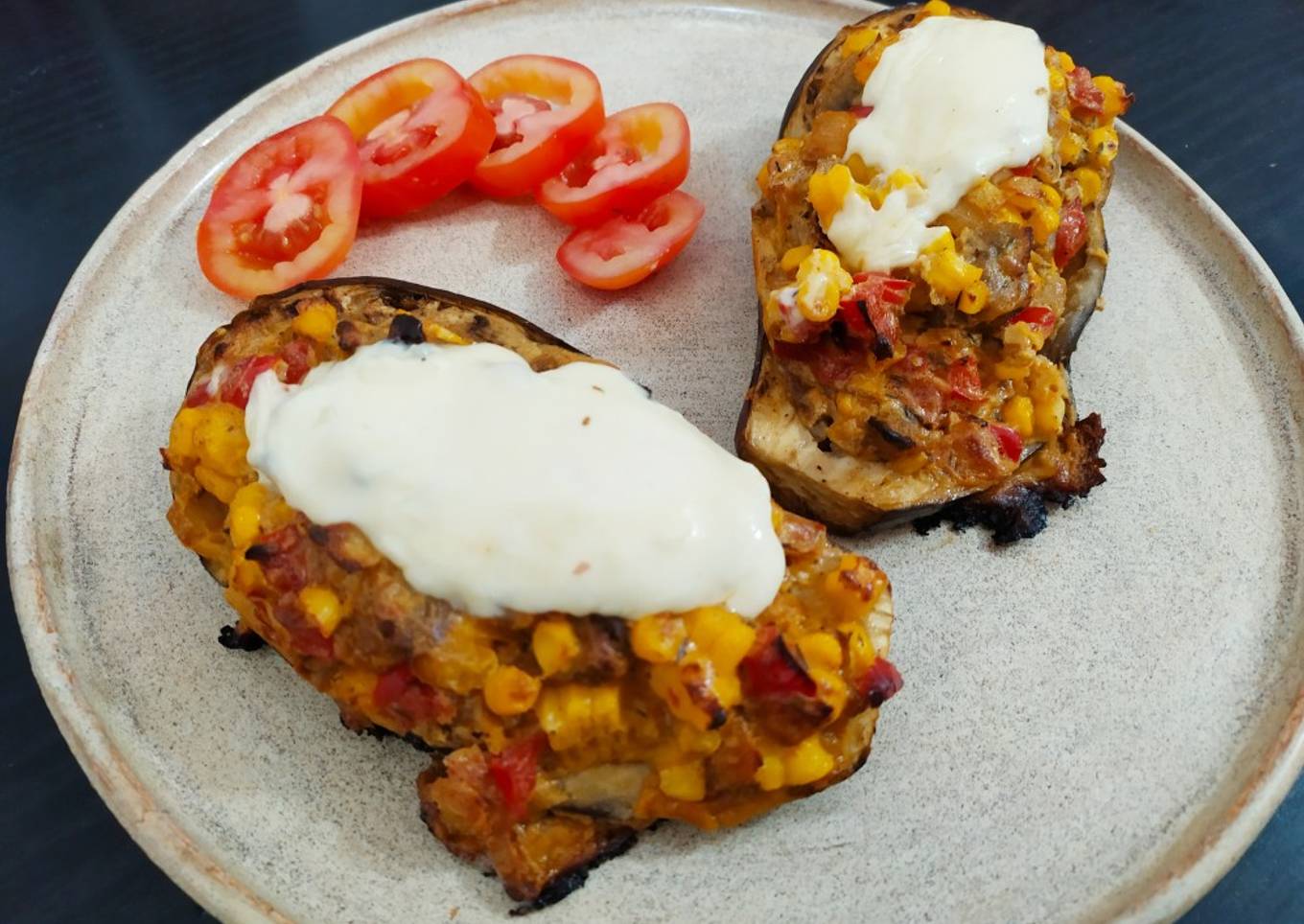 - Dejar enfriar y luego agregar el huevo, 4 cucharadas de queso crema y el choclo. Mezclar y rellenar las berenjenas.