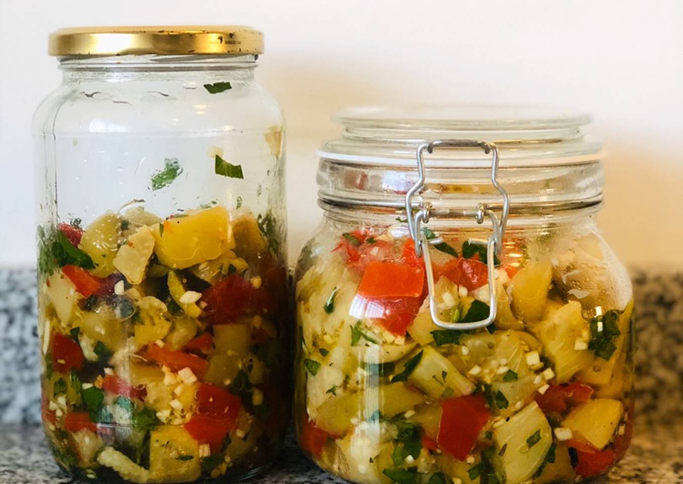 - Una vez listo todo colocar en un bowl grande para poder integrar todo. Agregarle aceite y sal. Lleva buena cantidad de aceite pero lo dejo a gusto, yo le voy agregando para integrar y un chorrito mΓ‘s para formar bien el escabeche. Luego poner en un recipiente con tapa y a la heladera a reposar. Ideal para acompaΓ±ar con carnes, milanesas y hasta con una galleta para engaΓ±ar al estΓ³mago jaja!