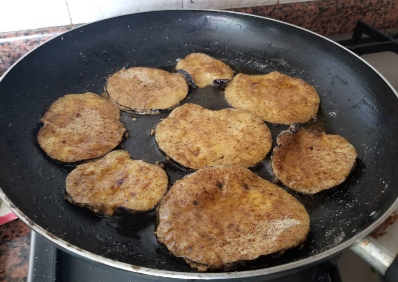 - Rebozar bien las rodajas de berenjena en la clara de huevo, luego pasarlas por la mezcla de la harina, sal y especias.