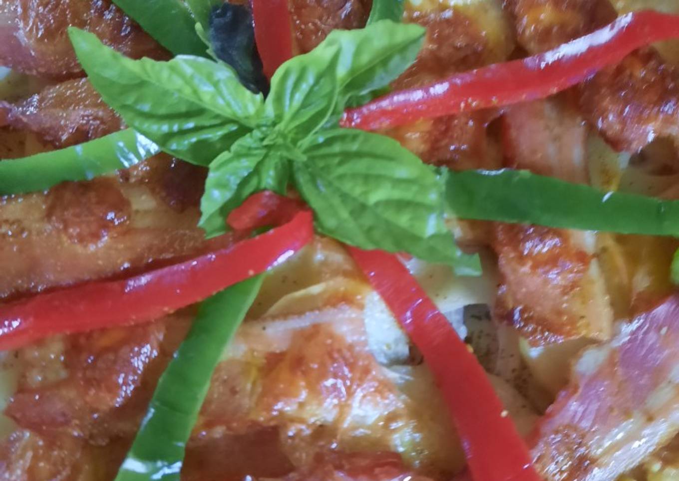 - Decoré con hojas de albahaca fresca, tiritas de morrón rojo y verde.