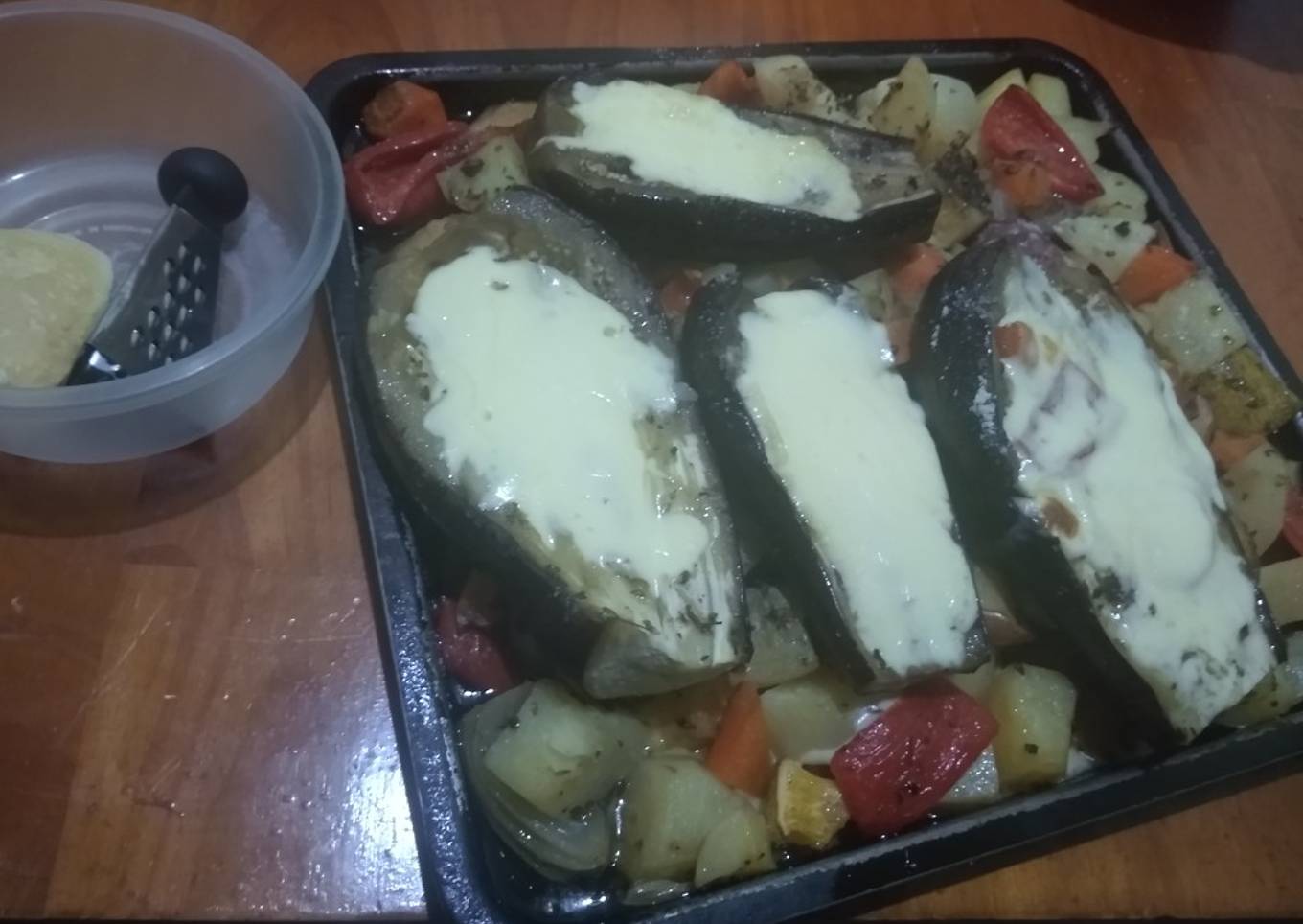 - Una vez terminada la preparación poner todas la verduras en una asadera o fuente de vidrio y acomodarlos y agregar las berenjenas arriba boca abajo como muestra la foto..