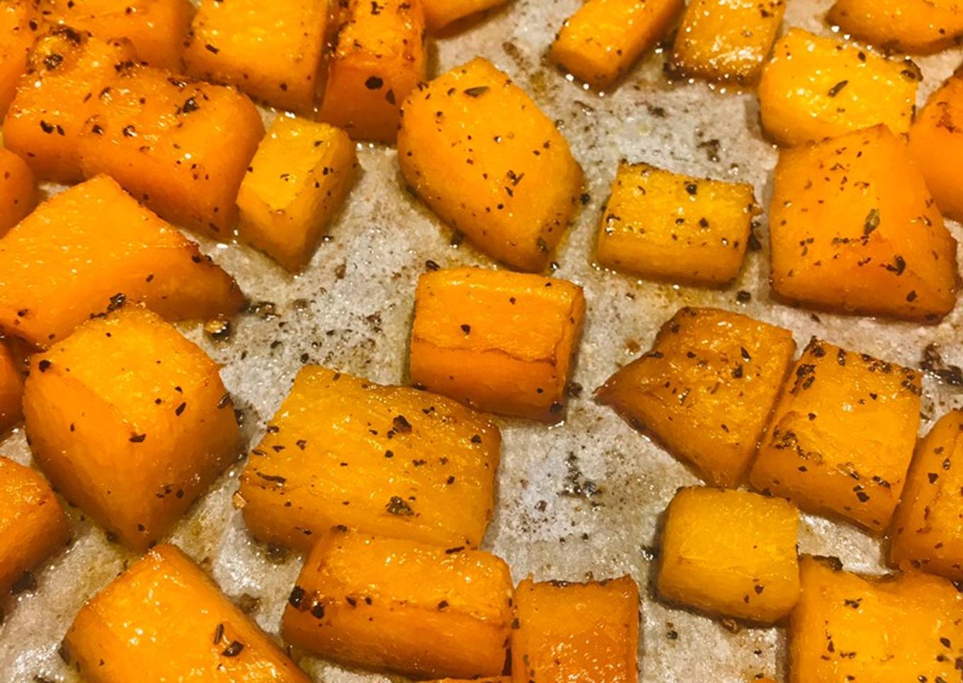 - En la bandeja del horno se coloca papel vegetal y encima los dados de calabaza. Se mezcla con el resto de ingredientes.