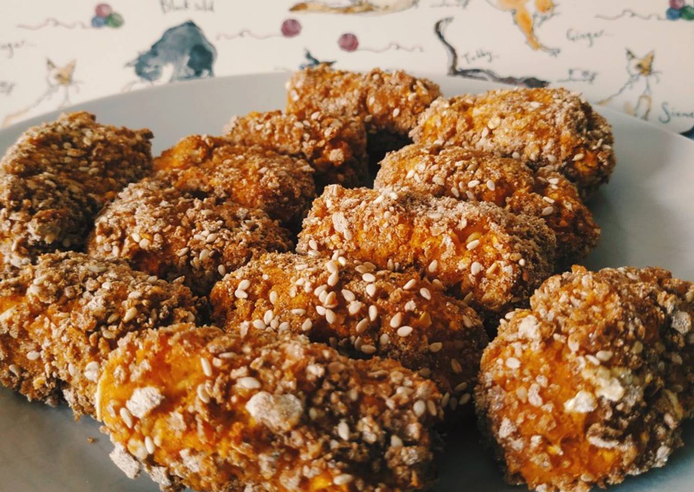 - Con la mano o una cuchara sopera, hacer la forma de las croquetas y rebozar con el resto del pan y el lino triturado y las semillas de sésamo
