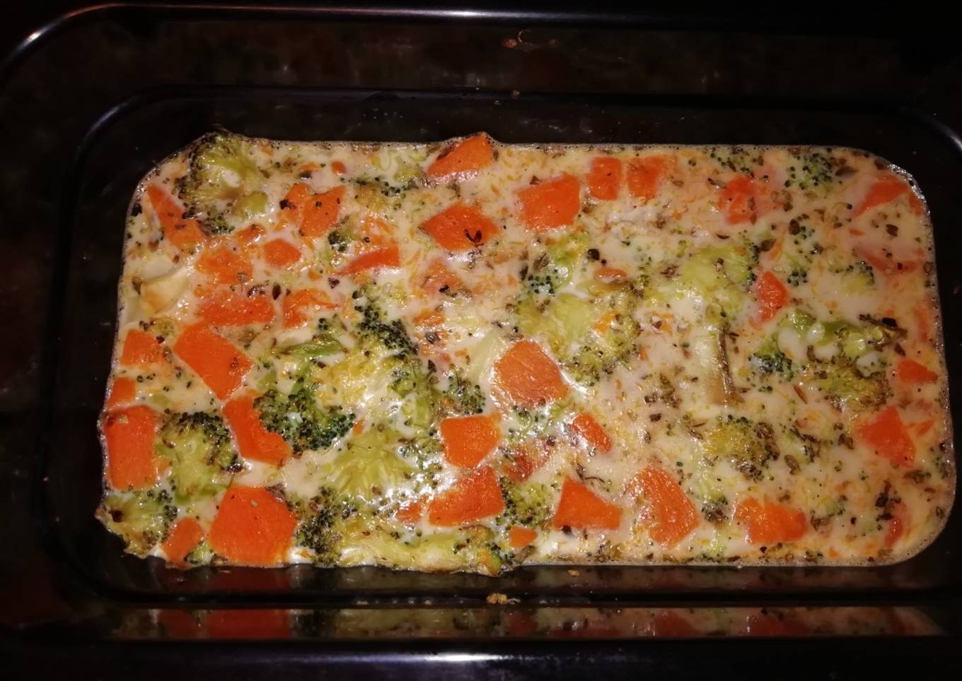 - A continuación, en un recipiente para horno, (en mi caso es rectangular), añadimos las verduras y encima los huevos batidos. Agregar especias al gusto.