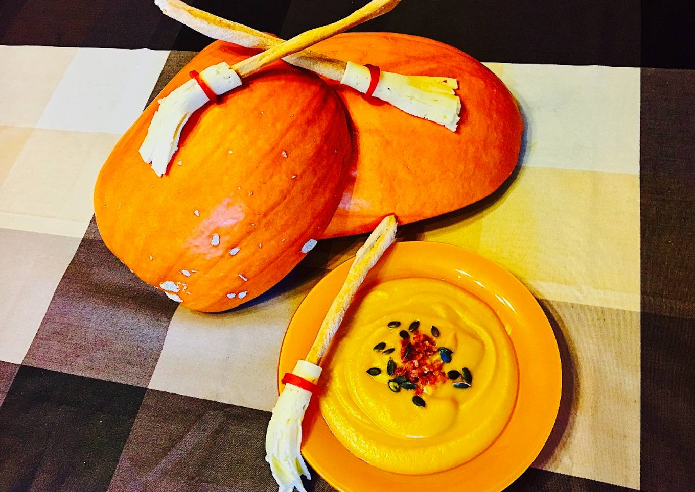 - Cortamos a trocitos muy pequeΓ±os el jamΓ³n serrano y lo espolvoreamos en la crema a la hora de servir junto con las pepitas de calabaza. Con el palito de pan y una loncha de queso confeccionamos la escoba de bruja.